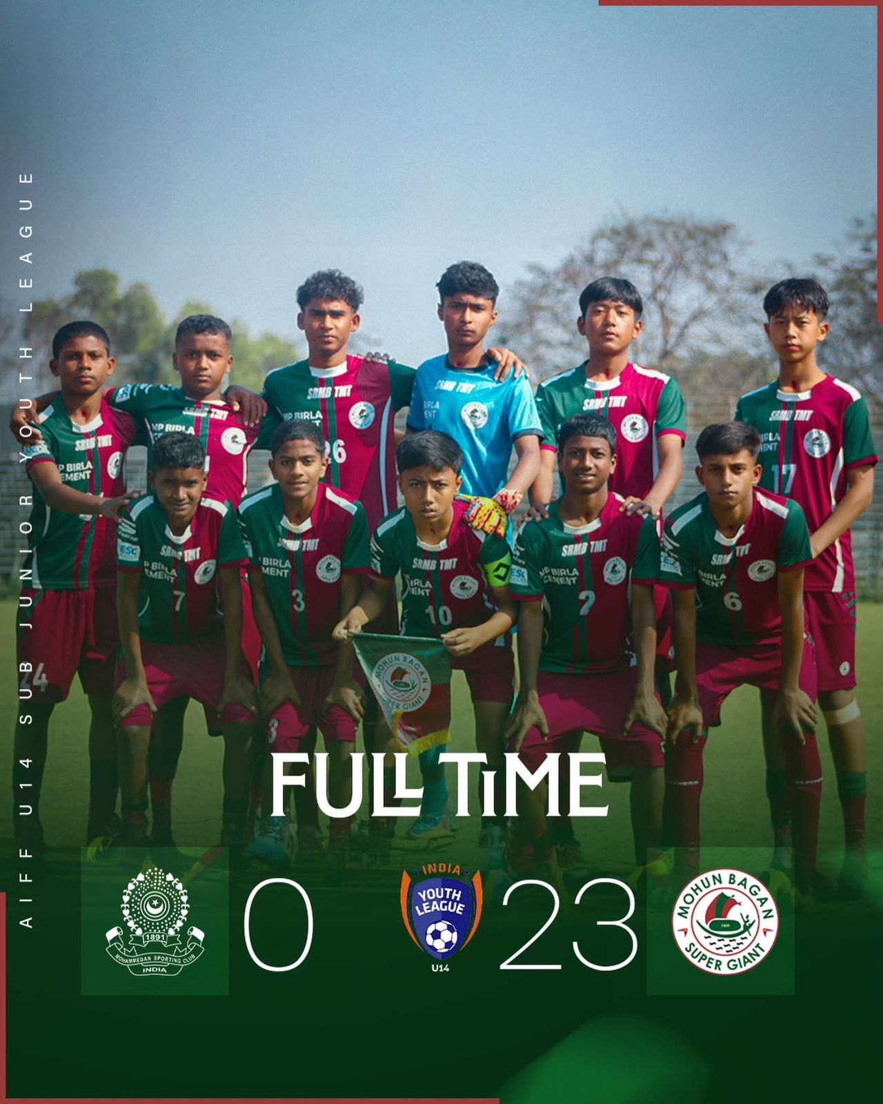 Kolkata: In an astonishing display of attacking football at the AIFF U14 Youth League, Mohun Bagan Super Giant’s U14 side hammered Mohammedan Sporting Club 23–0 in today’s match, a result that will be remembered for its sheer dominance.